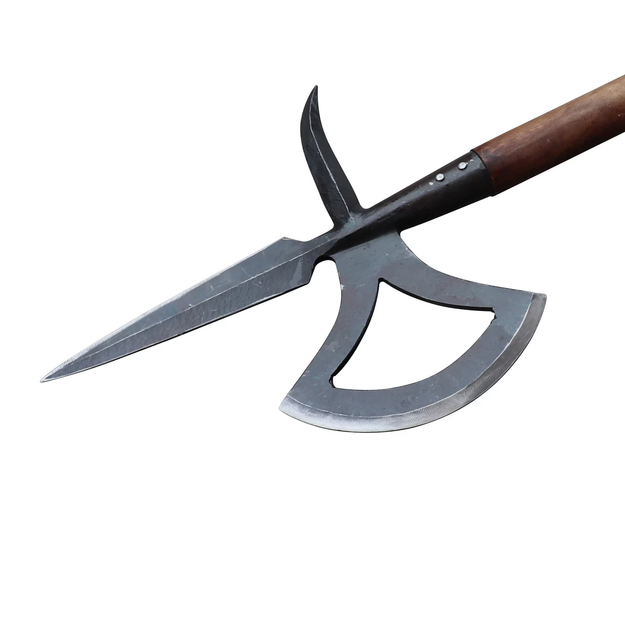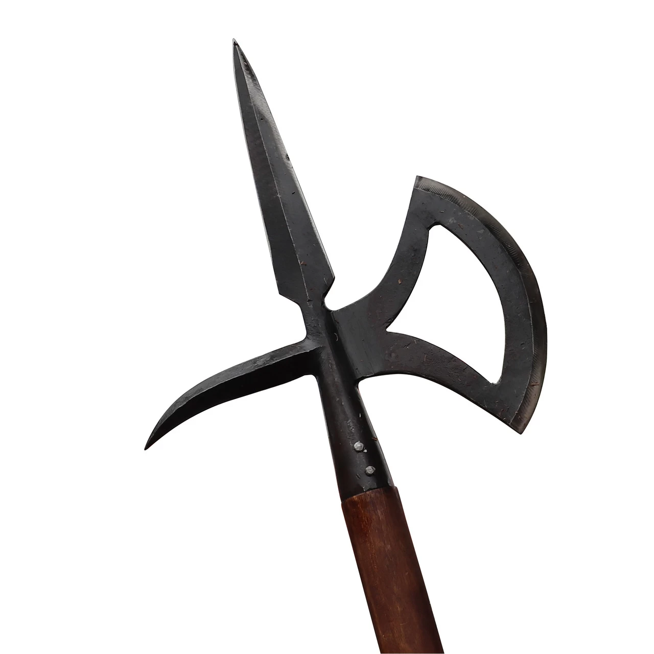 Poleaxes were effective at defeating armored opponents and opponents on horseback. The hook or thorn located on the spine of the axe head was used to grapple mounted warriors, and the spike on top could potentially pierce armor and deliver a killing blow when thrusted into your opposer. This replica medieval poleaxe features an open-bladed construction, meaning that the center of the axe is cut out. This reduces the weight, just as a fuller reduces the weight of a sword blade. The axe head is forged from iron, and has a weathered appearance. The 34.5-inch shaft is made from durable sheesham wood. Arm yourself for the battle ahead with this reliable poleaxe, and youโll be prepared for anything in your way. Overall Length: 47 inches