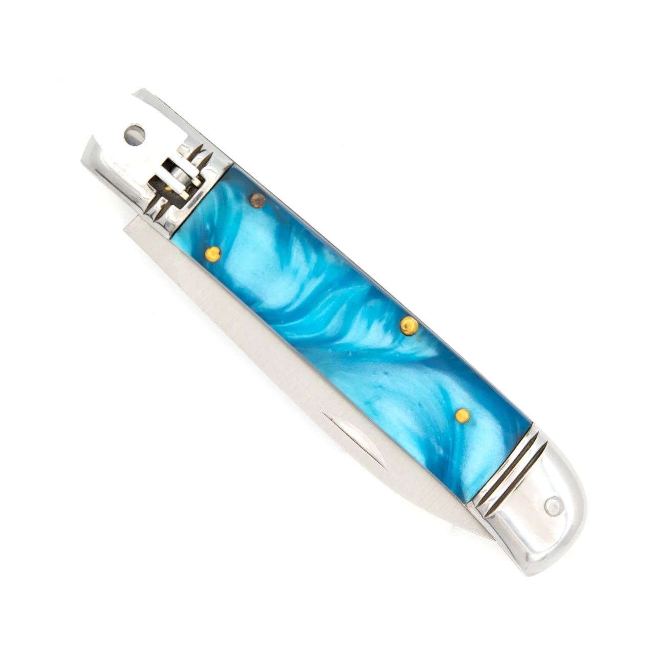 The Argent Leviathan Automatic Lever Lock Knife has stunning faux marble ABS grips paired with sleek silver hardware. The blade on this knife is stainless steel matching the hardware. This knife is an automatic knife with a lever lock mechanism which means that there is a lever on the bolster. If this lever is pressed down then the blade will deploy, swinging out of the left side of the handle. You press the lever down again to unlock the blade so you can guide it back into the handle to close it. If you flip the lever up then the blade cannot deploy. For even safer carry and storage, the Argent Leviathan Lever Lock Knife comes with its own black nylon sheath with a belt loop. Overall Length: 8 inches (Open), 4.5 inches (Closed). Weight: 0.4 lbs.