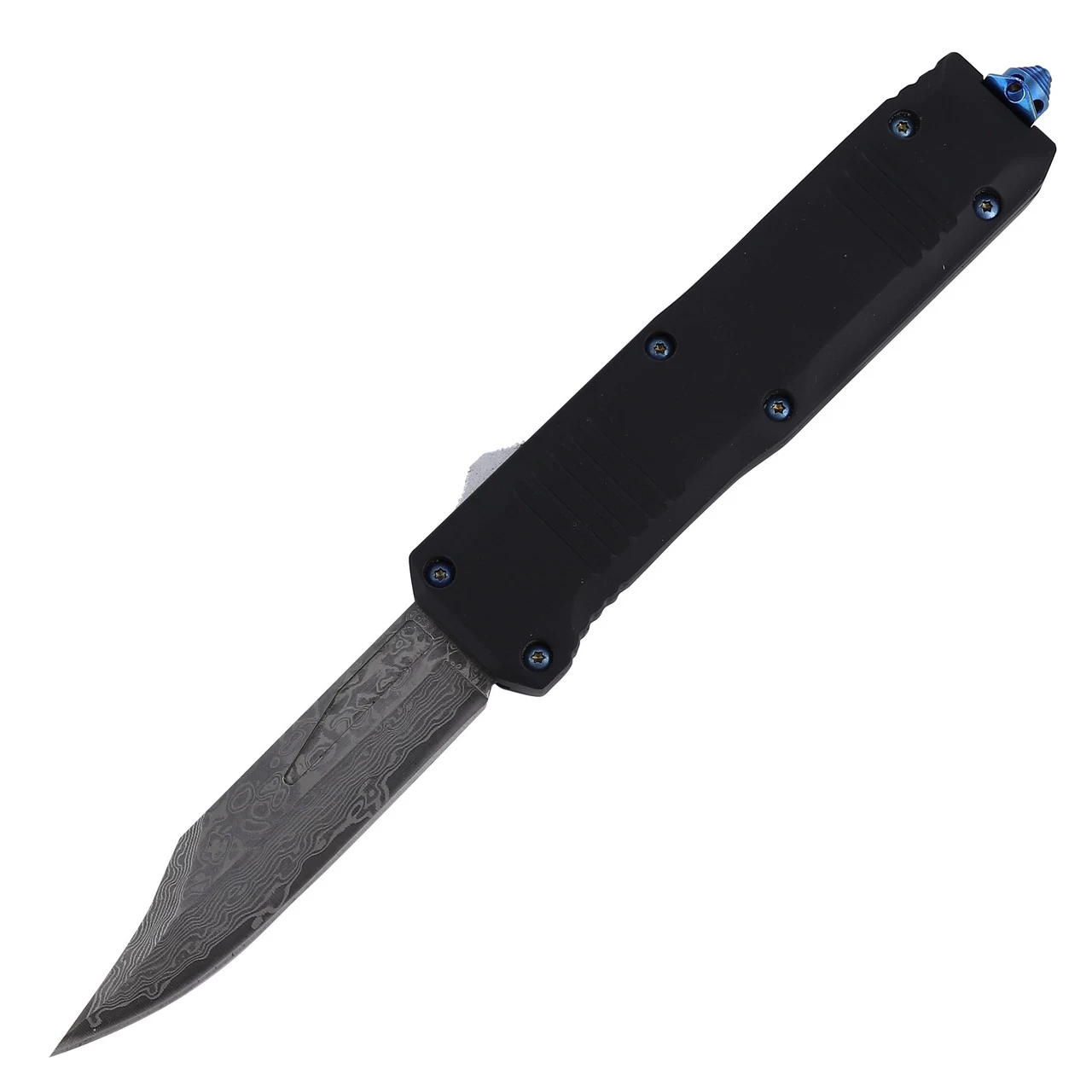 This powerful automatic dual action out the front knife is sure to tickle your fancy. The blade is made from 1095/15N20 Steels to create a gorgeous wave-pattern Damascus. When not in use, the blade is encased in the matte black zinc alloy handle. Use the silver switch on the side of the handle to deploy and retract the blade with little effort. The six sturdy hex screws holding the handle together, as well as the trusty pocket clip and glass breaker on the handle are anodized for a striking blue finish. A black nylon sheath is included with a quick release closure. Overall Length: 9.5 inches, Blade Length: 3.75