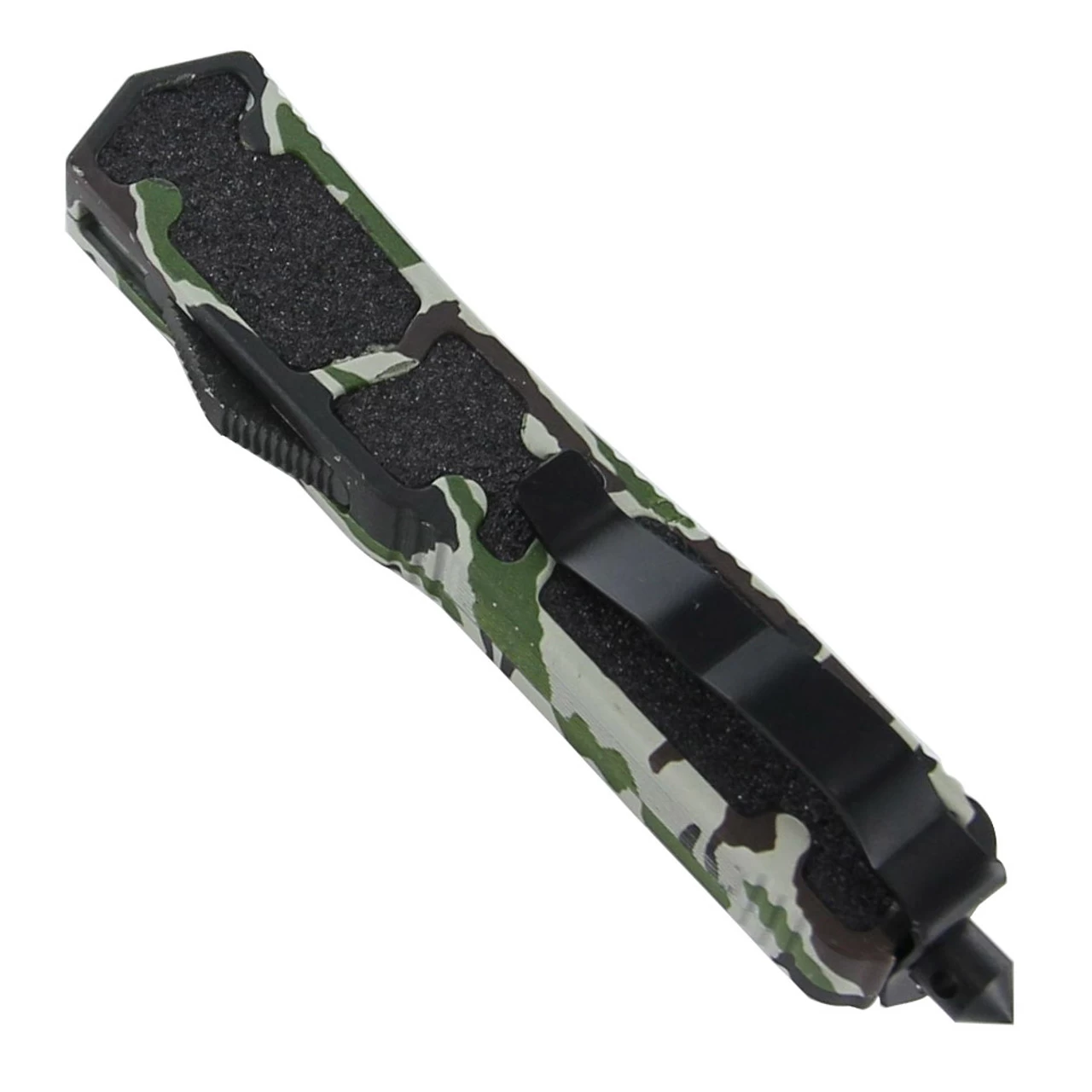 The outer casing is made from stainless steel with a camouflage design. Black sand paper inserts give a rough texture for a secure hold even when wet. The slide is featured on the side to provide flawless deployment and retraction. This slender blade pairs perfectly with the narrow handle. In a tanto style this blade comes with a saw on the spine for an array of outdoor uses. Made from stainless steel this durable knife will last for years to come. The back has a punch for emergencies with a pocket clip. As an added bonus it has a quick release nylon pouch. Overall Length: 8.5 Inches.