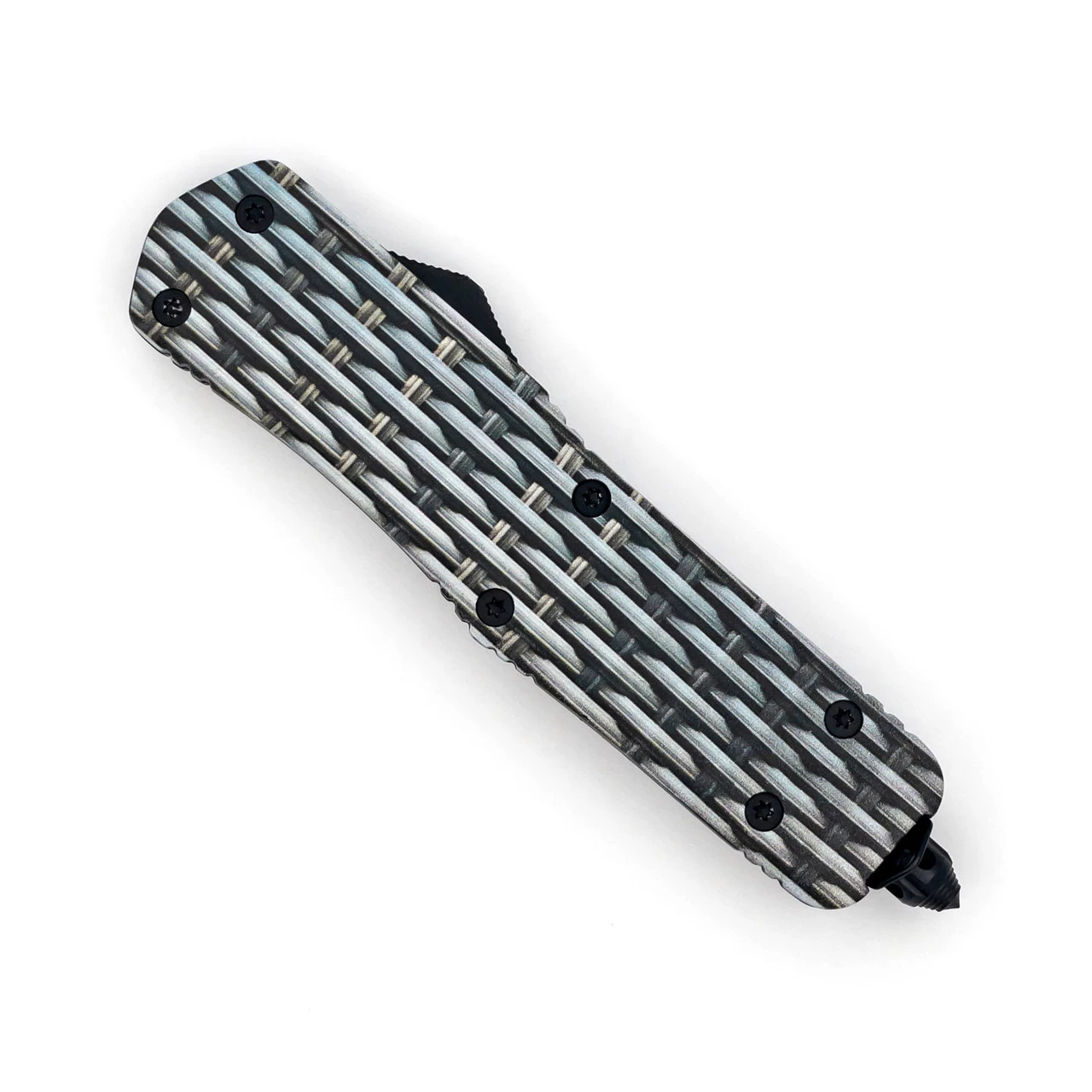 There really is something soothing about orderly weaving. It results in a stunning and mesmerizing design that invokes curiosity in those who see it. The Basket Case OTF Knife is a gorgeous OTF or out the front knife with a beautiful basket weave design on both sides of the handle. The blade itself is Damascus steel which is the combination of hundreds of layers of 15N20 and 1095 high carbon steel for a blade with a gorgeous wavy design in it. An OTF knife is characterized by a switch on one side that, when pushed, causes the blade to spring out from inside the handle. This style of automatic knife is very popular due to the added safety of the blade retracting fully into the handle when not deployed. The Automatic Basket Case OTF reminds me of a tropical paradise; the weave of plant fronds and the blade looks almost like smoke rising from a beach bonfire. Overall Length: 9 Inches, Blade Length: 3.75 Inches