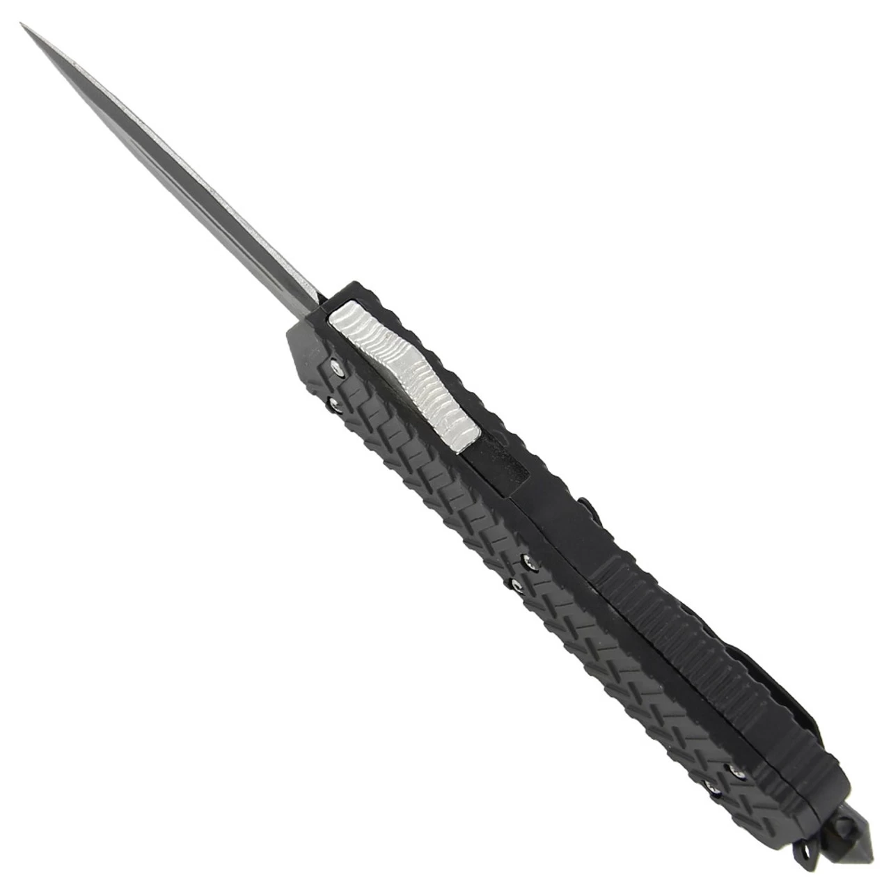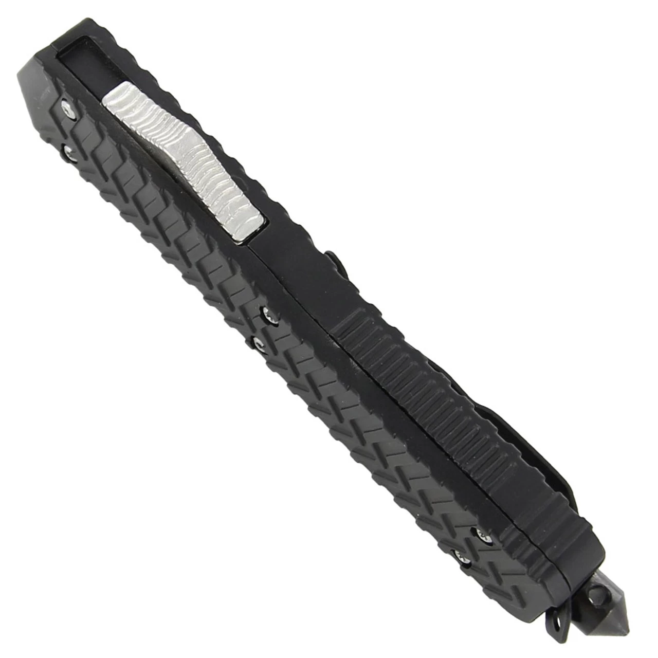 Given its rugged features the Automatic OTF Deadly Vow makes a great pocket knife. The stylish textured aluminum handle creates a firm hold in all weather conditions. A belt/pocket clip is provided to carry your knife with you at all times. In other words, Dont leave home without it. The blade comes in a two tone design and is constructed from stainless steel. A spear point style blade is best for slicing and piercing but with a smooth fast deployment it just makes it awesome. All you need to do is slide the trigger forward to deploy and backwards to retract. No fuss at all. And if the situation arises this knife comes standard with a glass breaker just in case because you never really know what may happen. Overall Length: 8.50 Inches, Blade Length: 3.25 Inches