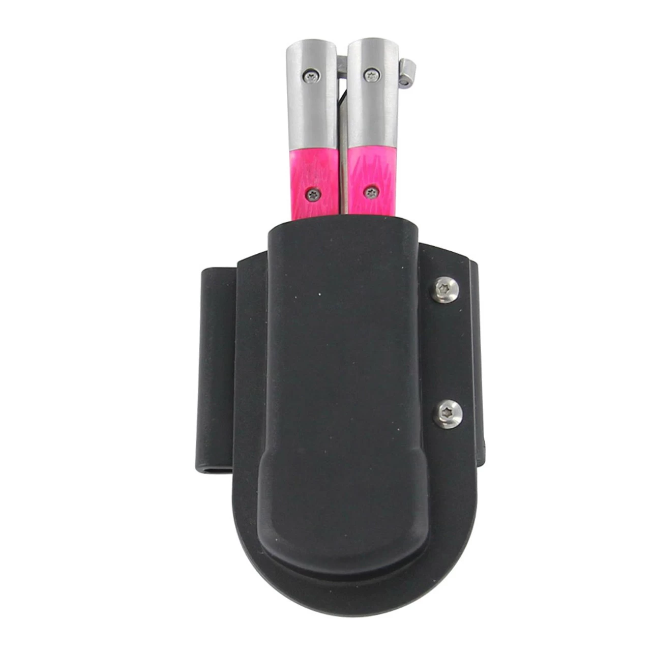 Okay boys step aside there is a new butterfly in town and it is just for the girls. Decked out in pink this knife is stunning. The drop point blade is made from Damascus steel that consists of 1095/15N20 Alloy Steel. The HRC is around 54 to 55 with 176 true blade layers. The random pattern is just impeccable. Come closer and get a good look at all the swirls that are remonstrant of flowing water. This knife has a heavy duty construction with the double pin blade and double walled handle. The first wall is the stainless steel frame with the second being the hot pink textured mounts. Lock the handles open and closed with the safety latch that is featured at the end of the bite handle. The ABS sheath is useful for transporting your blade. It even has a pocket clip so it wont get lost in the bottom of your purse.Overall Length: 8.75 Inches.