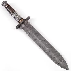This short scimitar features a stainless steel blade with a black ABS textured handle and zinc aluminum accents. Carved into the handle are two moons and two clovers. The blade comes factory sharp and housed in a scabbard also constructed of a black abs material with zinc aluminum accents with carved ancient symbols. Overall Length: 16.25 Inches.