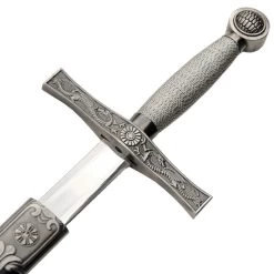 The Carolingian dynasty is back! From the time period circa 8th century when the triangle pommel sword became popular comes this nicely made replica with modern flair. This sword has a beautiful Damascus pattern, double edged blade and is ready to display or use for formal functions. Measuring 30.5 inches in length and 1.75 inches in width, the sharp Damascus steel blade has 176 layers with an HCR of about 54 to 55. Guard and pommel are both made of brass with curved design. The pommel is a pointed triangle with upward curved hand guard. The handle is wood with nice grain pattern. The handleโs overall length is 7.5 inches with a 5 inch grip area. Included with this sword is a hand crafted adjustable back sheath. The reddish brown leather sheath makes for a nice accent. (Note item is handmade making each sword a one of a kind piece with authentic tool markings and grazed areas for a historical treasure.) Overall length: 38 inches, Blade Length: 30.5 inches