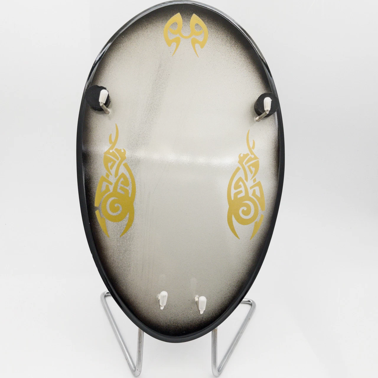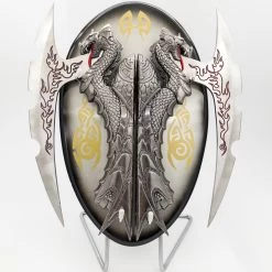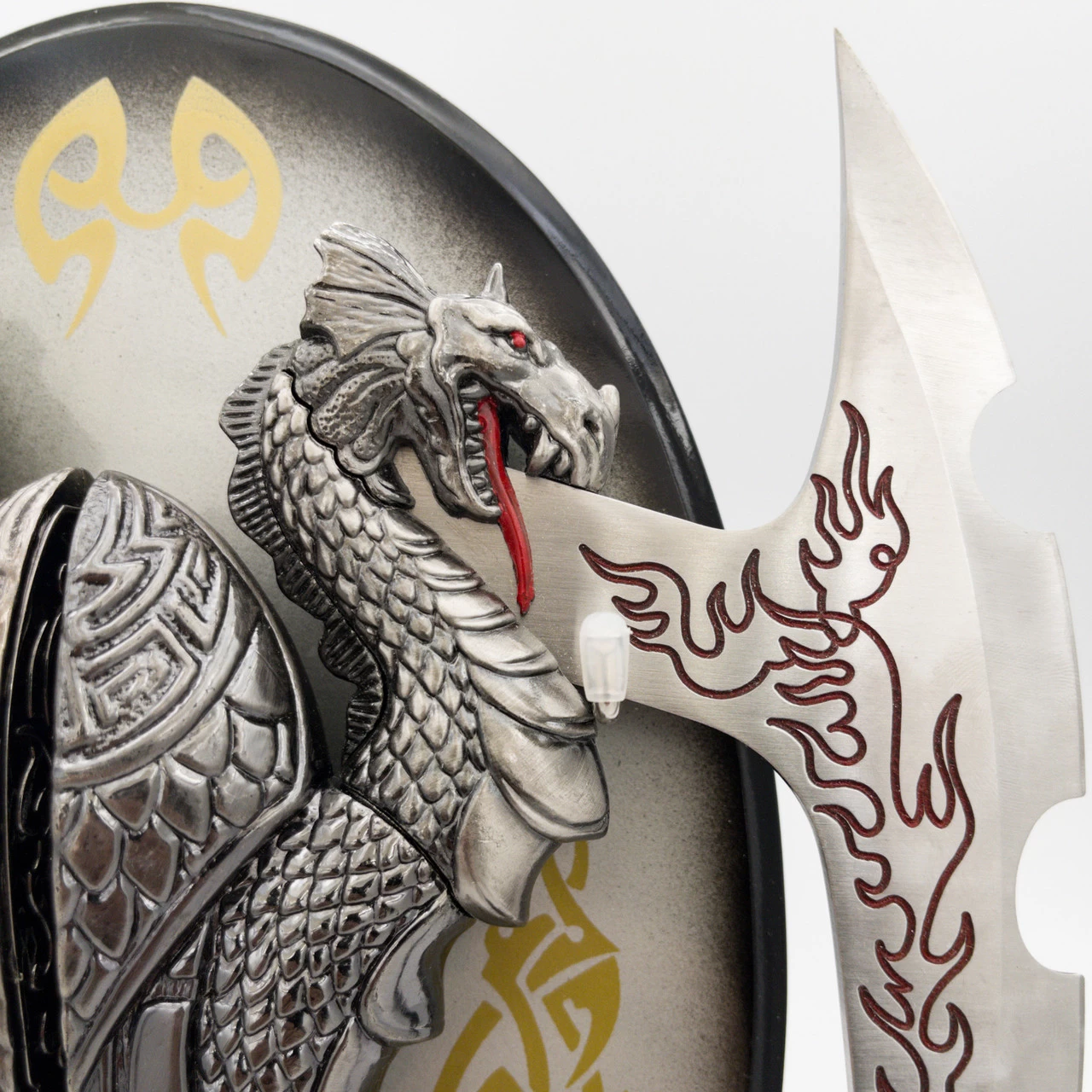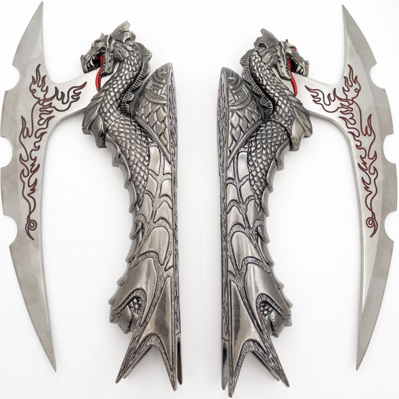 The Corrupted Inferno Decorative Display Fantasy Dragon Knives Set of 2 is a set of two gorgeous fantasy knives. The handles are shaped like dragons intricately detailed to appear as if they are breathing fire right into the blade. The silver finish creates a graceful and ominous gleam off of the knives and causes the red detailing on the dragonโs eyes, tongue, and the fire on the blade to come alive vividly. This piece is not lacking when it comes to detail. Every scale on the dragons composing the handles is clearly visible. The broader scales on the dragonโs belly create a finger grip that makes the knives feel comfortable in the hand. The blade is stainless steel with a red outline around the fire the dragons are breathing out over both blades. This fire is only featured on one side of the blade; however, the dragon looks just as detailed from either side. The Corrupted Inferno Decorative Display Fantasy Dragon Knives Set of 2 comes with a wall plaque that doubles as a stand so you can display this epic piece anywhere you please. Overall Length: 10.5 Inches. Weight: 3.9 lbs.