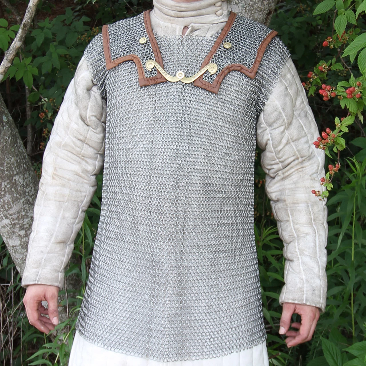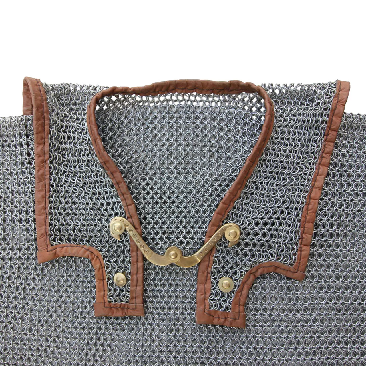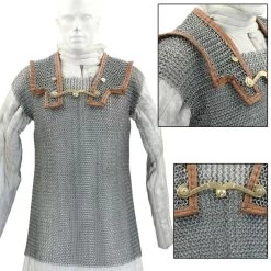 One of the primary armor types used by the Romans as they conquered the then known world along with the plated Lorica Segmentata, the Lorica Hamata was an early form of chainmail armor well before its time. While the original suits were made from bronze or iron, this superb replica features alternating rows of 9mm riveted and solid 16 gauge mild steel rings to form a sleeveless shirt that reaches about mid-thigh. Lined with premium leather piping which is folded over the edges and stitched through, a square-bottomed U shaped shoulder doubling is attached to the body by a row of rings along the back bottom edge. Riveted to the center of the chest is a pair of S-shaped brass hooks which can be hooked onto a stud on each flap. This set is fully wearable but can also be used as an attractive display, it comes oiled to ensure quality and long term maintenance. Chest Size: 55 Inches, Weight: 16 lbs