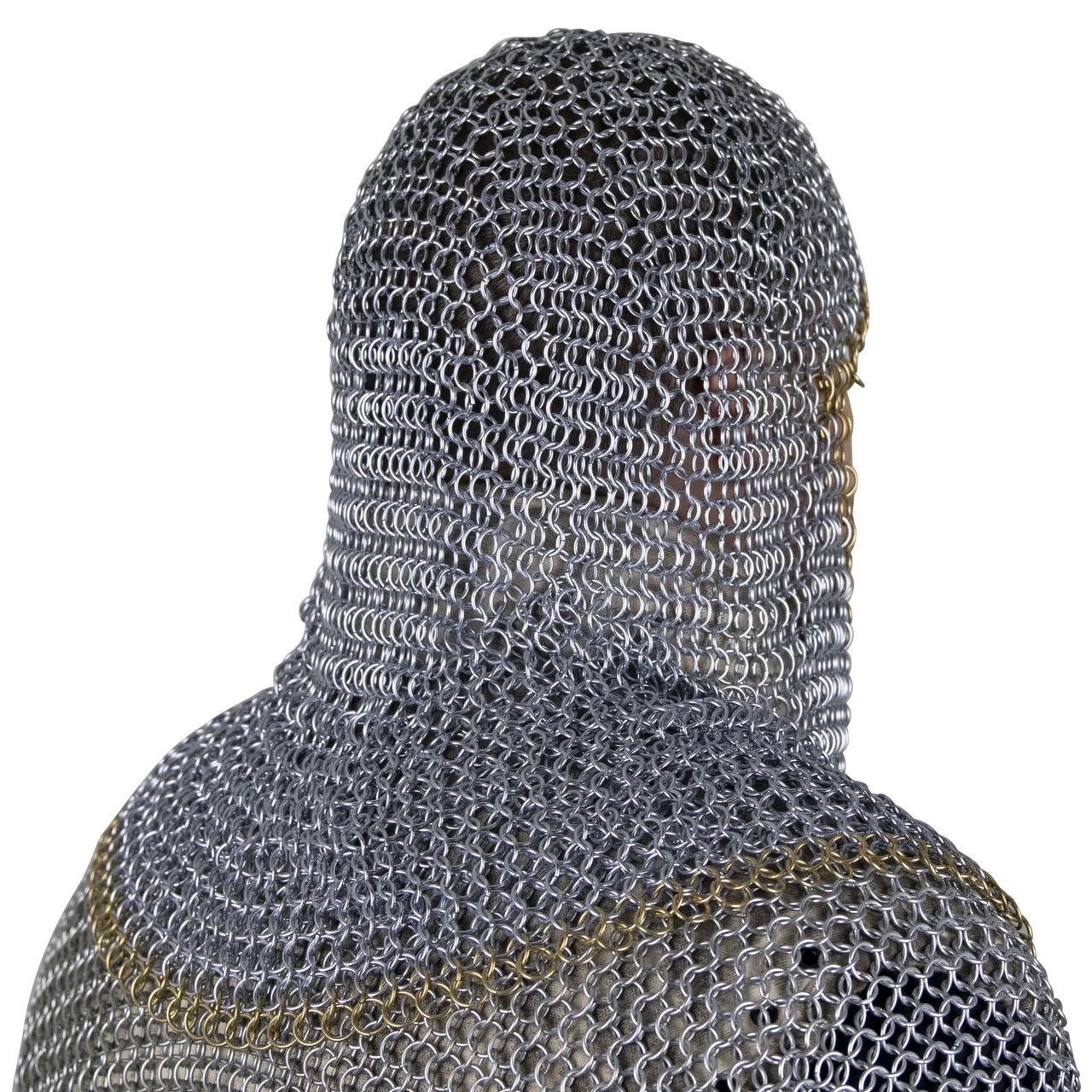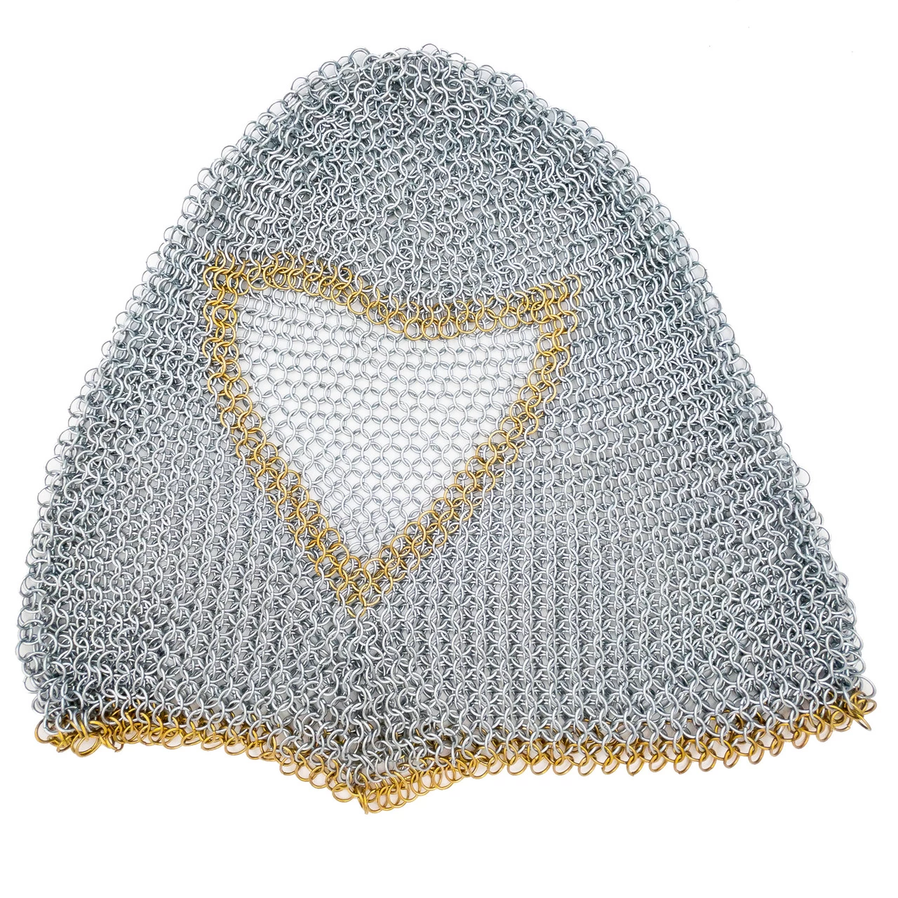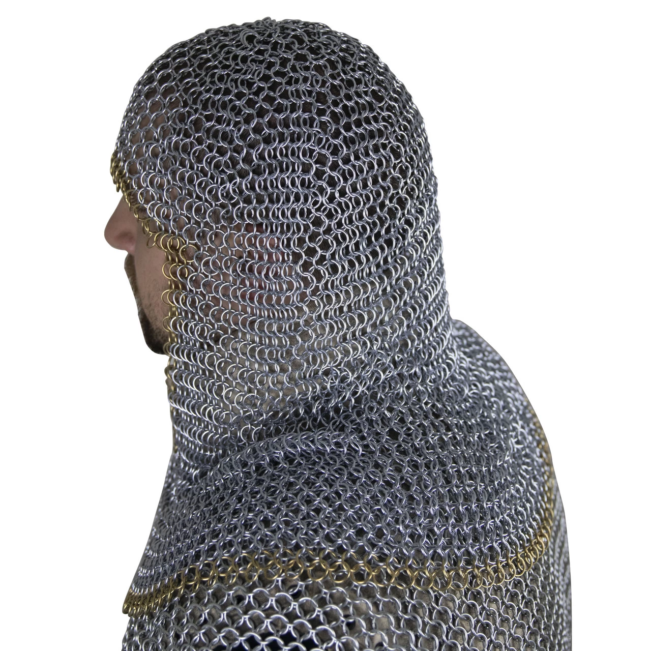Medieval protection for the head used mainly from the 11th to the beginning of the 14th century. It consisted of a close-fitting mail hood extending down to cover the neck and parts of the shoulders, occasionally attached to the hauberk. The mail coif was made in the same manner at the mail hauberk or shirt. Often worn over a padded coif and under a helmet, however in numerous medieval illuminated manuscripts knights and soldiers are shown with just the mail coif protecting the head. Our historically accurate mail coif is made from high tensile wire. The coif is made using the European 4 in 1 pattern of butted links. The mail coif has a polished steel finish, aside from the pure brass row of links around the bottom and face for a touch of flair.