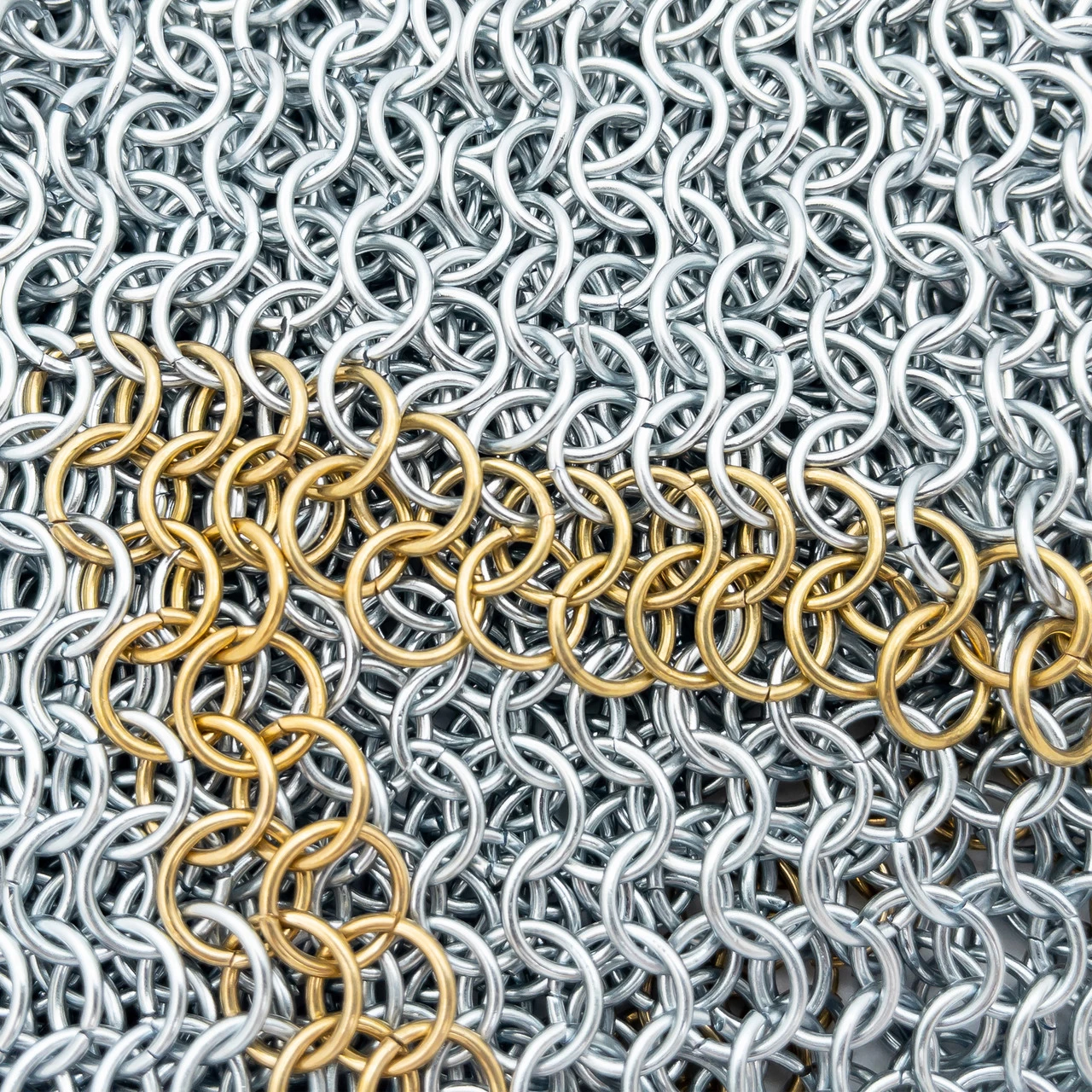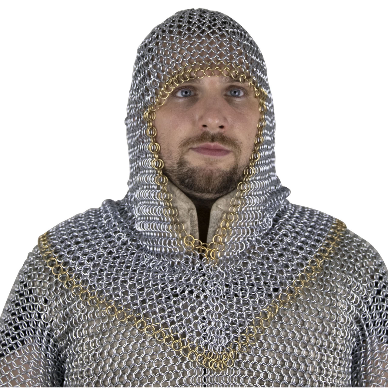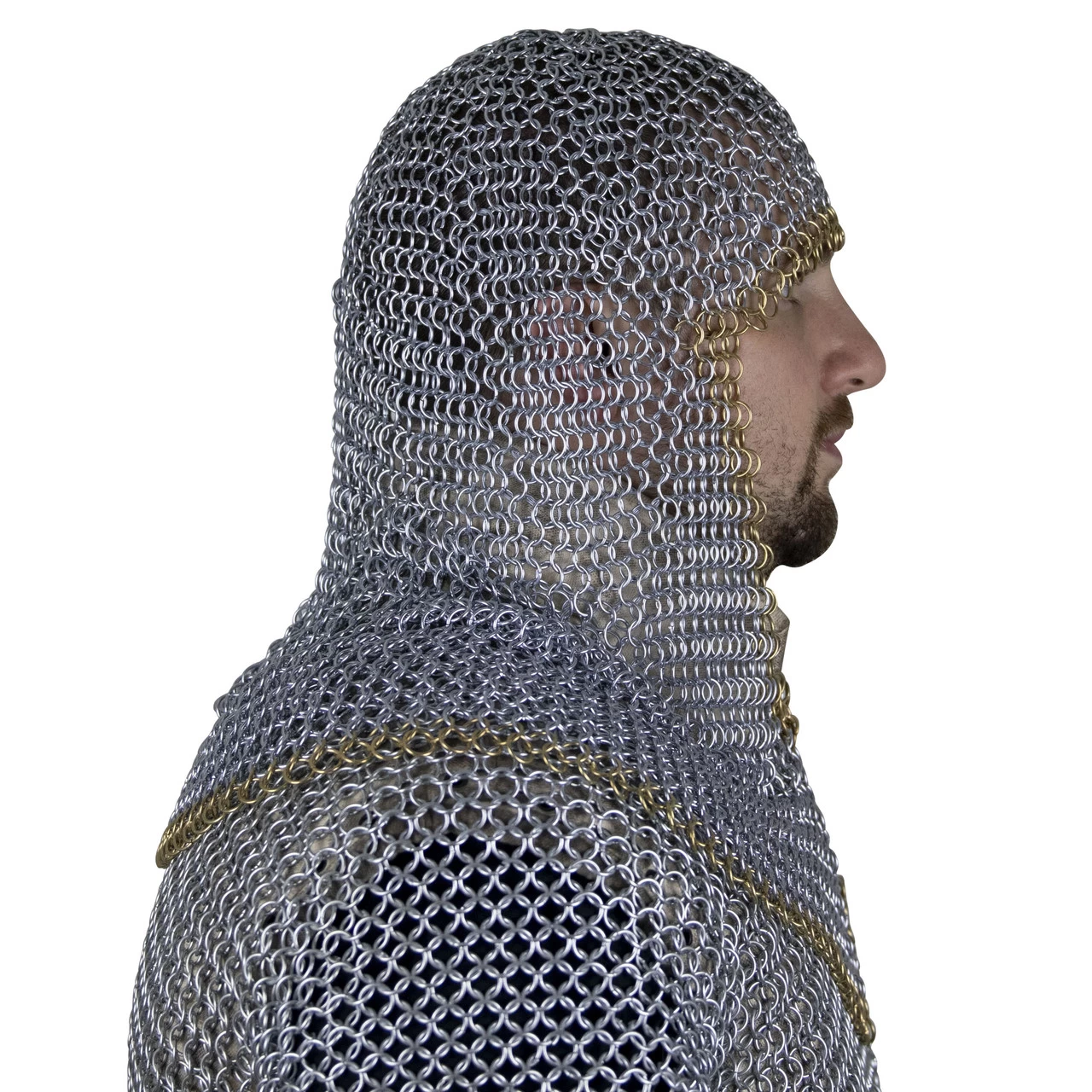 Medieval protection for the head used mainly from the 11th to the beginning of the 14th century. It consisted of a close-fitting mail hood extending down to cover the neck and parts of the shoulders, occasionally attached to the hauberk. The mail coif was made in the same manner at the mail hauberk or shirt. Often worn over a padded coif and under a helmet, however in numerous medieval illuminated manuscripts knights and soldiers are shown with just the mail coif protecting the head. Our historically accurate mail coif is made from high tensile wire. The coif is made using the European 4 in 1 pattern of butted links. The mail coif has a polished steel finish, aside from the pure brass row of links around the bottom and face for a touch of flair.