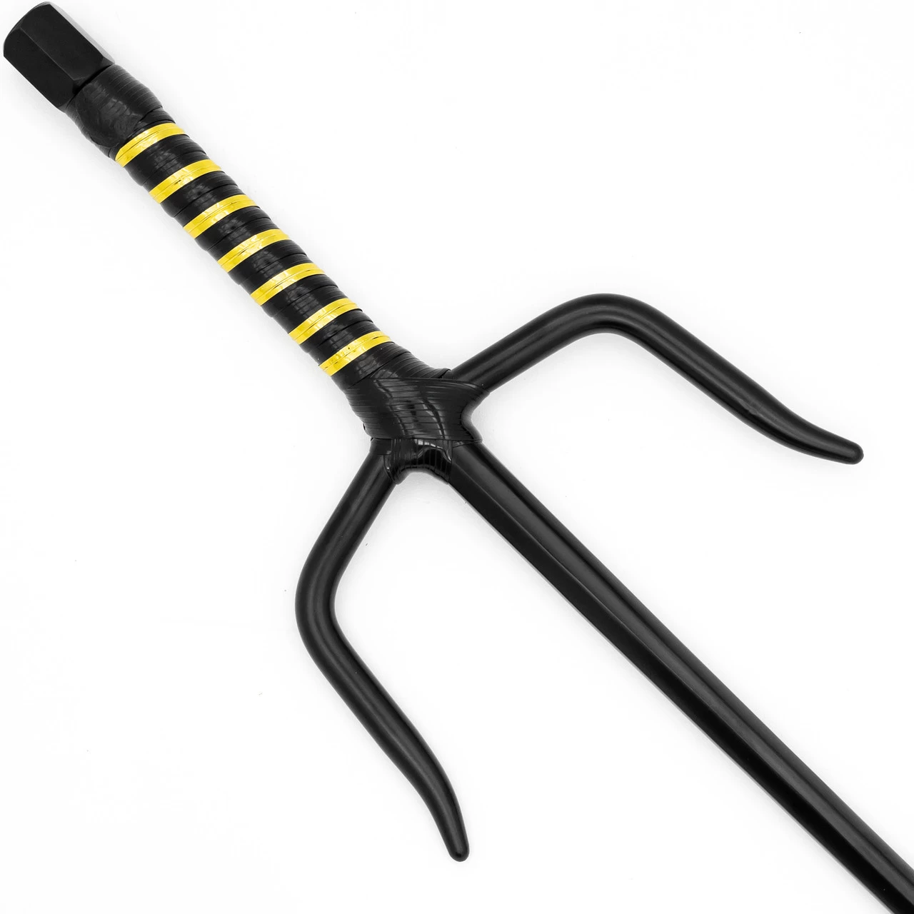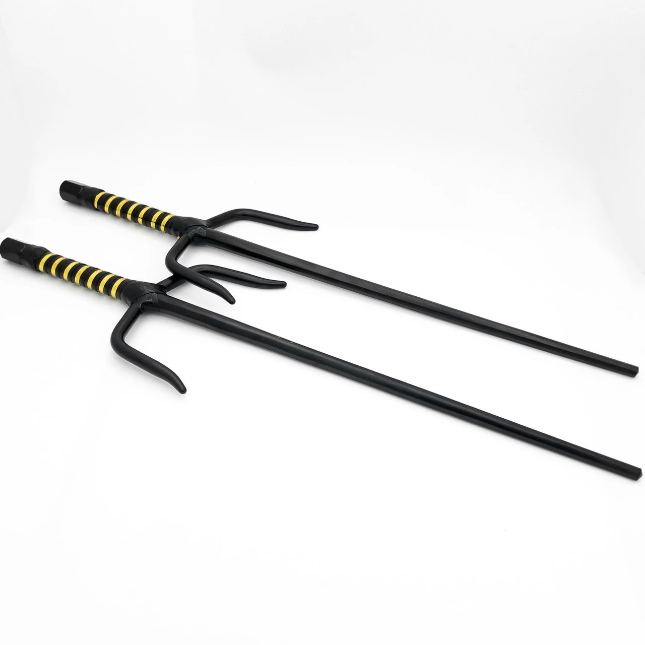 The Moonlit Demonstration Octagonal Sai Pair is a pair of octagonal sai composed of stainless steel with a black anodized finish. The sai feature the trademark three prongs and this set is full tang. The handles are stainless steel with a wrap composed of plastic with metal thread. The wrap is black, matching the blade, however it also features a thick gold line that spirals up the handle adding the perfect splash of color to these sai. The weight on these sai is 1.6 lbs. so these are not necessarily just for practice. These Moonlit Demonstration Octagonal Sai are perfect for a beginner since they arenโt sharp, an intermediate trainer who is getting used to the weight, or a pro martial artist who needs a set for a demonstration. Overall Length: 21 Inches. Weight: 3.6 lbs.